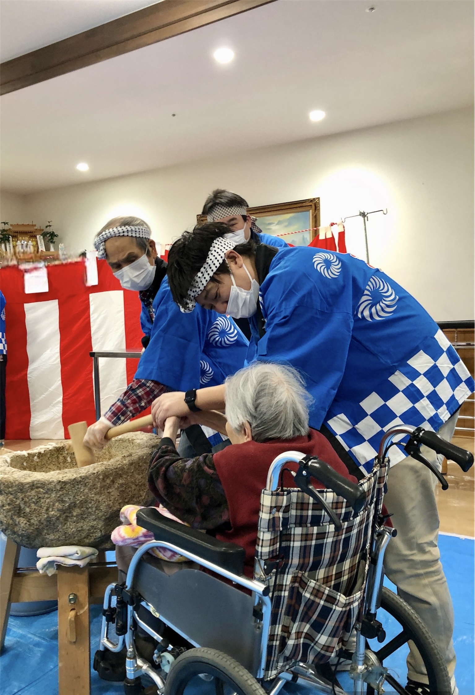 本日、ご契約中の施設で行われる餅つき大会に招待され、参加してきました。昔ながらの方法で大きな臼と杵を使って、懐かしい餅つきを入居者の皆さまと協力して楽しむことができました。