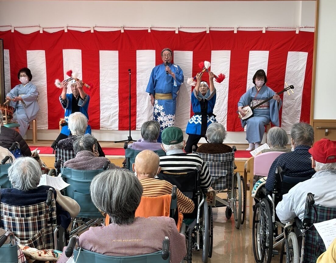 本日、ツぐハぐの契約先である特別養護老人ホームで「安来節」を披露するボランティア団体を招待し、伝統的な民謡である「安来節」を披露していただきました。